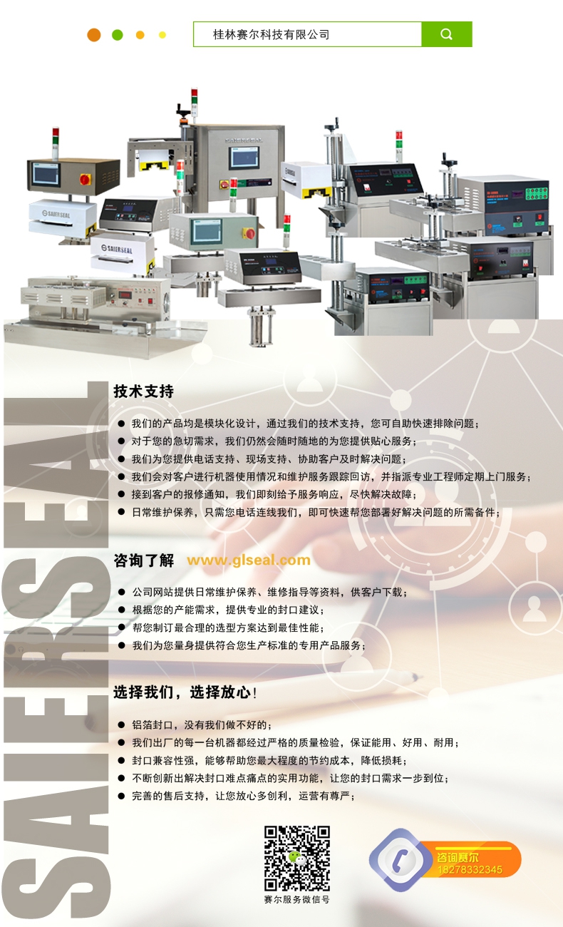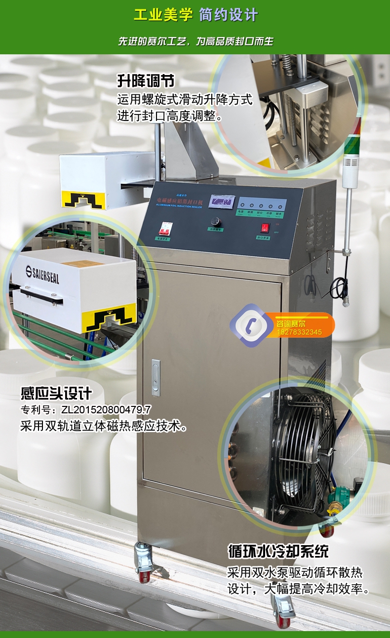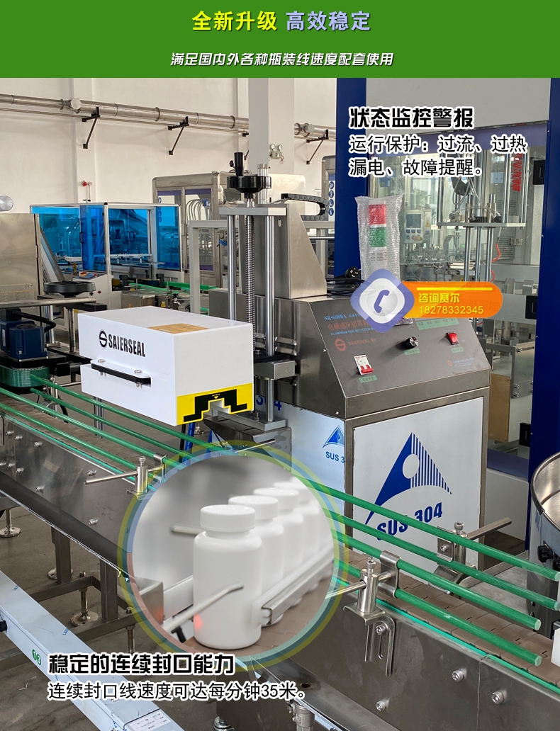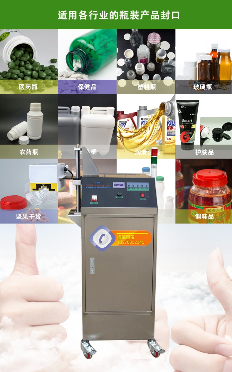 本機(jī)型封口通用性強(qiáng),配置先進(jìn),操作簡單,滿足瓶裝線的連續(xù)封口要求,可針對不同化工物料的性狀特點(diǎn)進(jìn)行封口強(qiáng)度調(diào)節(jié),達(dá)到美觀牢固的產(chǎn)品密封目的;本型號參照美系進(jìn)口鋁箔封口機(jī)的技術(shù)指標(biāo),結(jié)合國內(nèi)化工廠普遍的封口需求進(jìn)行技術(shù)升級,做到了穩(wěn)定性好、兼容性高、使用率強(qiáng),并具備抗磁干擾、耐腐防潮、漏電保護(hù)、異常報(bào)警等多項(xiàng)先進(jìn)功能,是一款能達(dá)到嚴(yán)格封口,滿足自動瓶裝線可靠封口的電磁感應(yīng)鋁箔封口機(jī)。